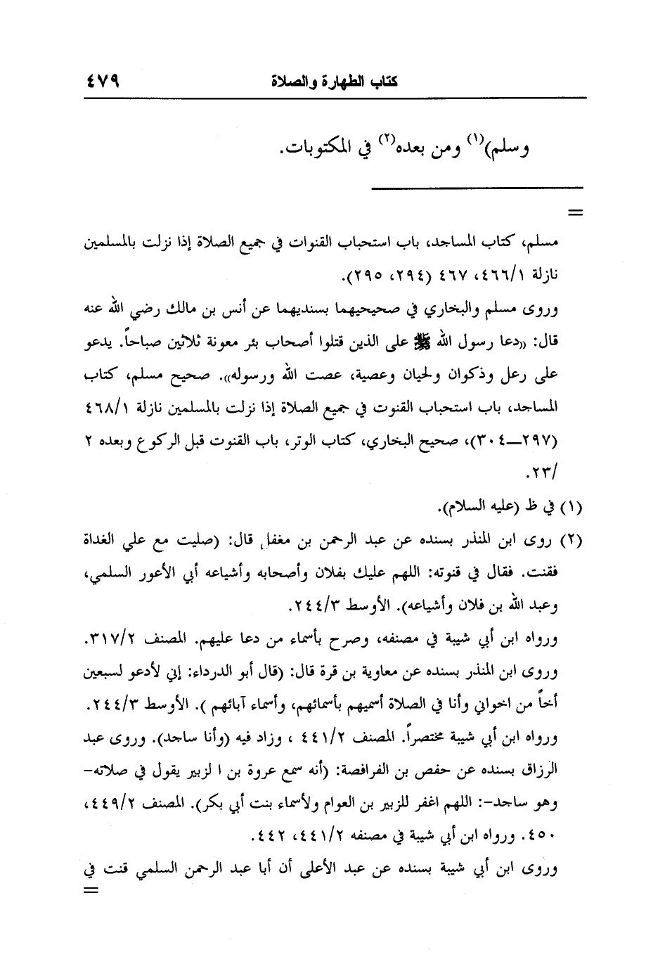 2 روى ابن المنذر بسنده عن عبد الرحمن بن مغفل قال: (صليت مع علي الغداة فقنت. فقال في قنوته: اللهم عليك بفلان وأصحابه وأشياعه أبي الأعور السلمي، وعبد الله بن فلان وأشياعه) . الأوسط 3/244.