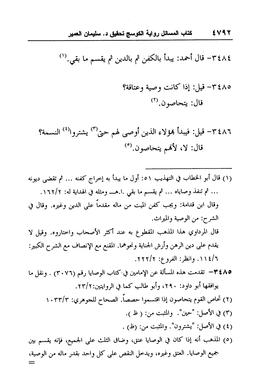 [3485-*] تقدمت هذه المسألة عن الإمامين في كتاب الوصايا رقم (3076) . ونقل ما يوافقها أبو داود: 290، وأبو طالب كما في الروايتين:2/23.