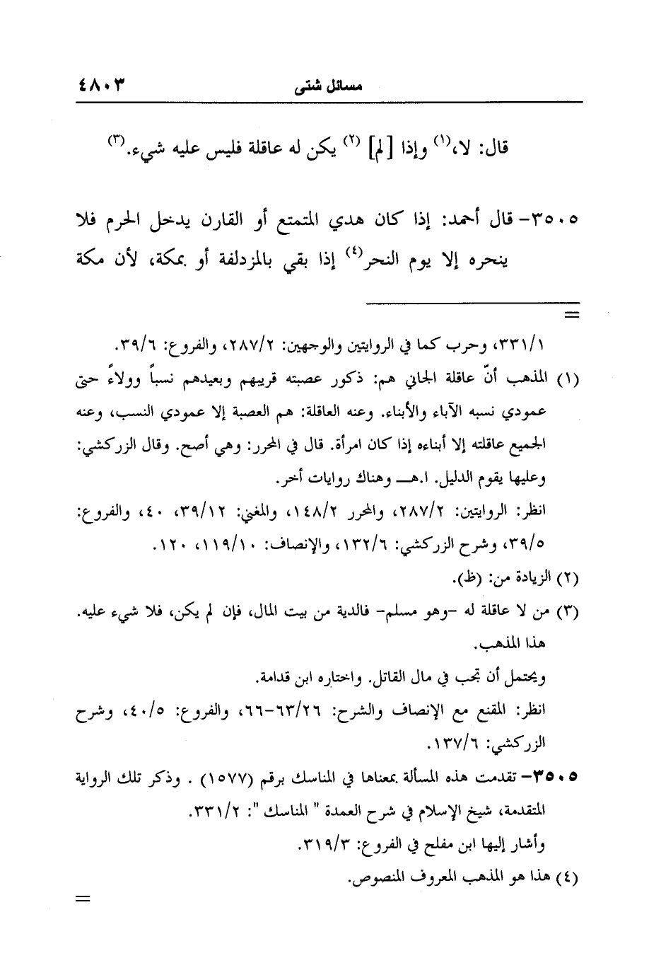 [3505-*] تقدمت هذه المسألة بمعناها في المناسك برقم (1577) . وذكر تلك الرواية المتقدمة، شيخ الإسلام في شرح العمدة " المناسك ": 2/331.