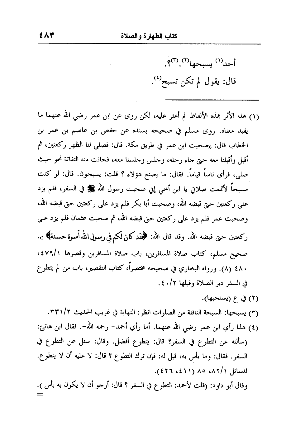 1 هذا الأثر بهذه الألفاظ لم أعثر عليه، لكن روى عن ابن عمر رضي الله عنهما ما يفيد معناه. روى مسلم في صحيحه بسنده عن حفص بن عاصم بن عمر بن الخطاب قال: "صحبت ابن عمر في طريق مكة. قال: فصلى لنا الظهر ركعتين، ثم أقبل وأقبلنا معه حتى جاء رحله، وجلس وجلسنا معه، فحانت منه التفاتة نحو حيث صلى، فرأى ناساً قياماً. فقال: ما يصنع هؤلاء؟ قلت: يسبحون. قال: لو كنت مسبحاً لأتممت صلاتي يا ابن أخي إني صحبت رسول الله صلى الله عليه وسلم في السفر، فلم يزد على ركعتين حتى قبضه الله، وصحبت أبا بكر فلم يزد على ركعتين حتى قبضه الله، وصحبت عمر فلم يزد على ركعتين حتى قبضه الله، ثم صحبت عثمان فلم يزد على ركعتين حتى قبضه الله. وقد قال الله: {لَقَدْ كَانَ لَكُمْ فِي رَسُولِ اللَّهِ أُسْوَةٌ حَسَنَةٌ} ". صحيح مسلم، كتاب صلاة المسافرين، باب صلاة المسافرين وقصرها 1/479، 480 (8) . ورواه البخاري في صحيحه مختصراً، كتاب التقصير، باب من لم يتطوع في السفر دبر الصلاة وقبلها 2/40.