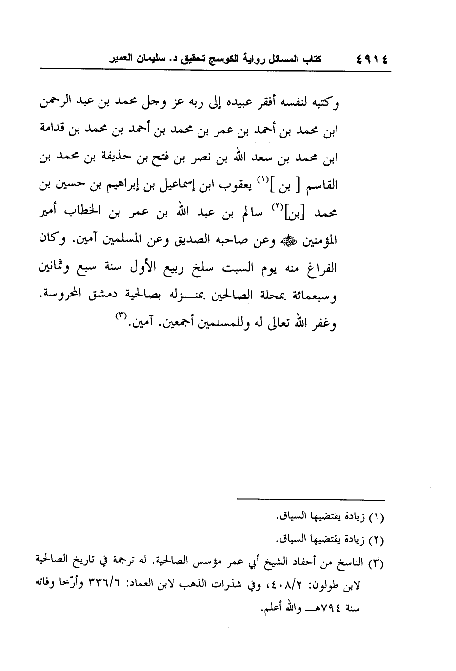 وكتبه لنفسه أفقر عبيده إلى ربه عز وجل محمد بن عبد الرحمن ابن محمد بن أحمد بن عمر بن محمد بن أحمد بن محمد بن قدامة ابن محمد بن سعد الله بن نصر بن فتح بن حذيفة بن محمد بن القاسم [بن] 1 يعقوب ابن إسماعيل بن إبراهيم بن حسين بن محمد [بن] 2 سالم بن عبد الله بن عمر بن الخطاب أمير المؤمنين رضي الله عنه وعن صاحبه الصديق وعن المسلمين آمين. وكان الفراغ منه يوم السبت سلخ ربيع الأول سنة سبع وثمانين وسبعمائة بمحلة الصالحين بمنزله بصالحية دمشق المحروسة. وغفر الله تعالى له وللمسلمين أجمعين. آمين.3