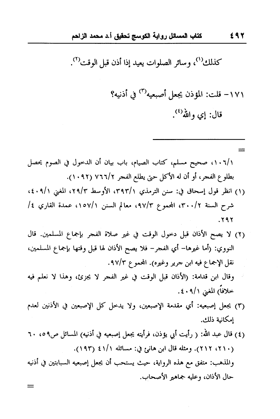 4 قال عبد الله: (رأيت أبي يؤذن، فرأيته يجعل إصبعيه في أذنيه) المسائل ص59، 60 (210، 212) . ومثله قال ابن هانئ في: مسائله 1/41 (193) .