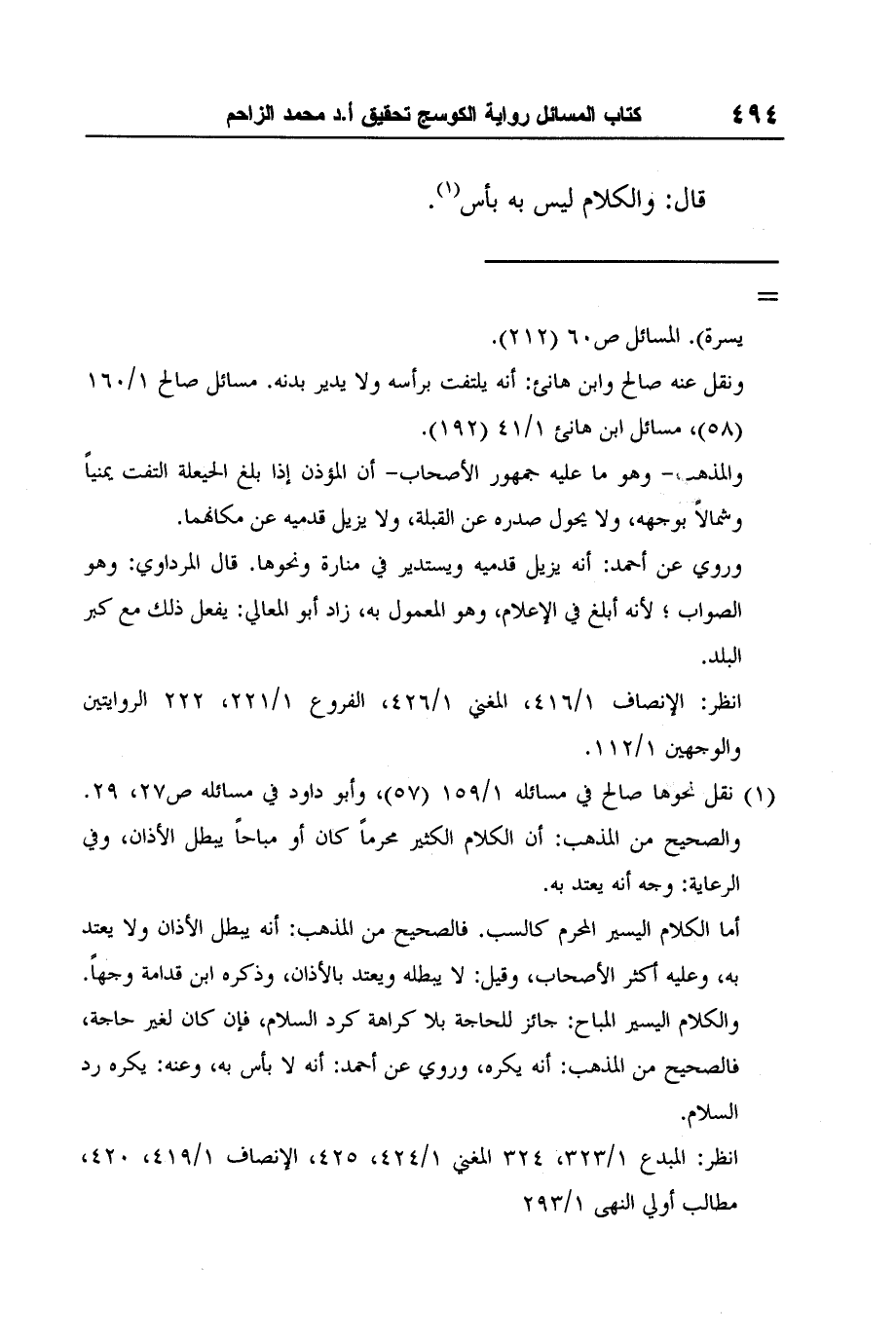 1 نقل نحوها صالح في مسائله 1/159 (57) ، وأبو داود في مسائله ص27، 29. والصحيح من المذهب: أن الكلام الكثير محرماً كان أو مباحاً يبطل الأذان، وفي الرعاية: وجه أنه يعتد به.