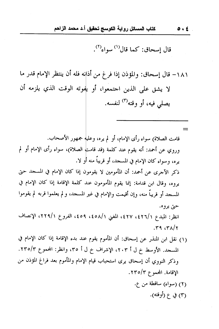 1 نقل ابن المنذر عن إسحاق: أن المأموم يقوم عند بدء الإقامة إذا كان الإمام في المسجد. الأوسط خ ل أ 203، الإشراف خ ل أ 35، وانظر: المجموع 3/235. وذكر النووي أن إسحاق يرى استحباب قيام الإمام والمأموم بعد فراغ المؤذن من الإقامة. المجموع 3/235.