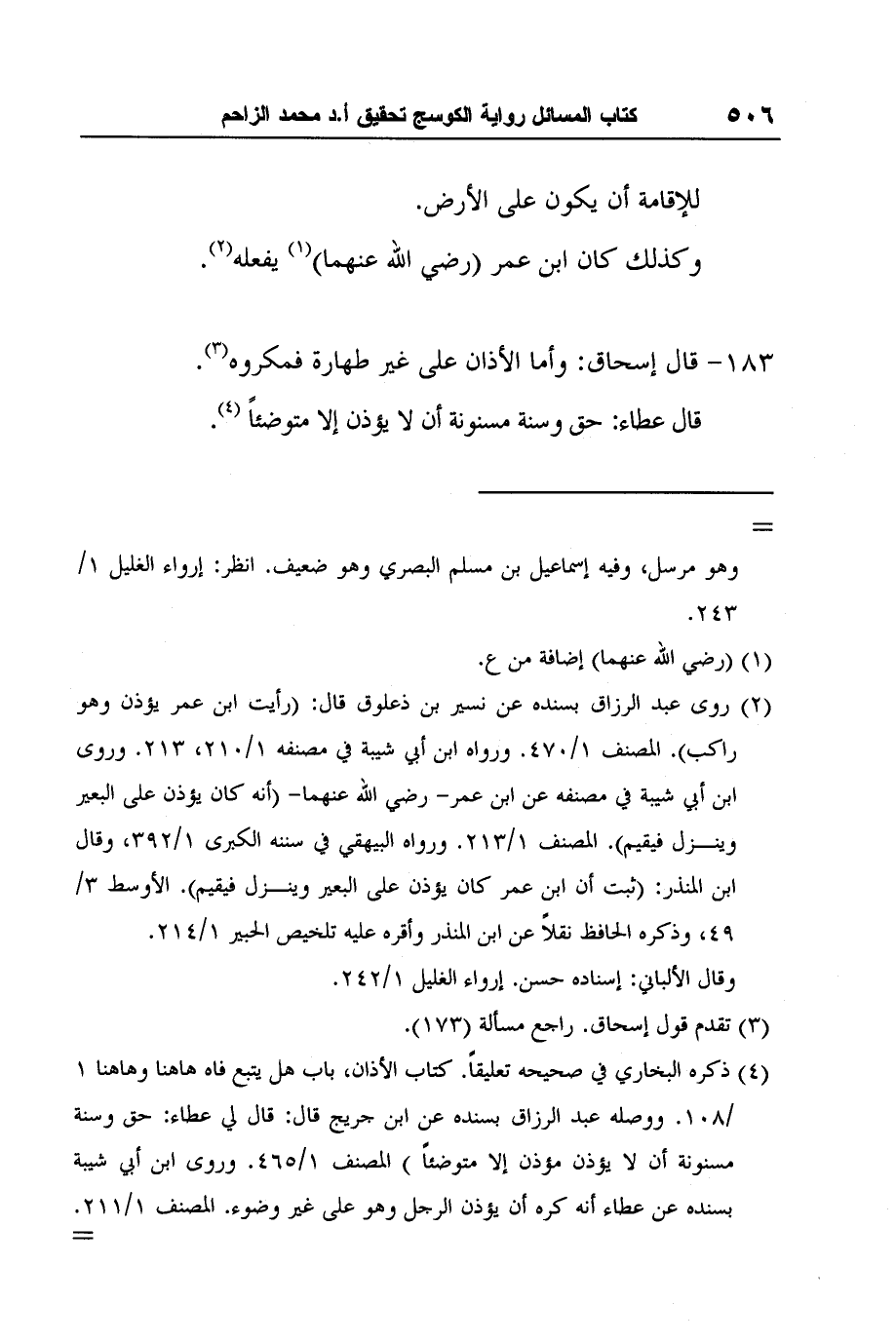 [183-] قال إسحاق: وأما الأذان على غير طهارة فمكروه3.
