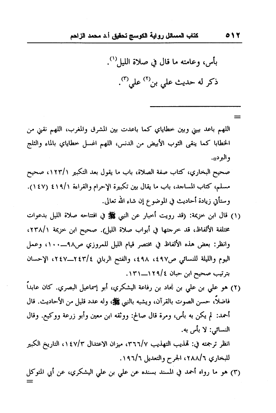 2 قال ابن خزيمة: (قد رويت أخبار عن النبي صلى الله عليه وسلم في افتتاحه صلاة الليل بدعوات مختلفة الألفاظ، قد خرجتها في أبواب صلاة الليل) . صحيح ابن خزيمة 1/238، وانظر: بعض هذه الألفاظ في مختصر قيام الليل للمروزي ص98ـ100، وعمل اليوم والليلة للنسائي ص497، 498، والفتح الرباني 4/243ـ247، الإحسان بترتيب صحيح ابن حبان 4/129ـ131.