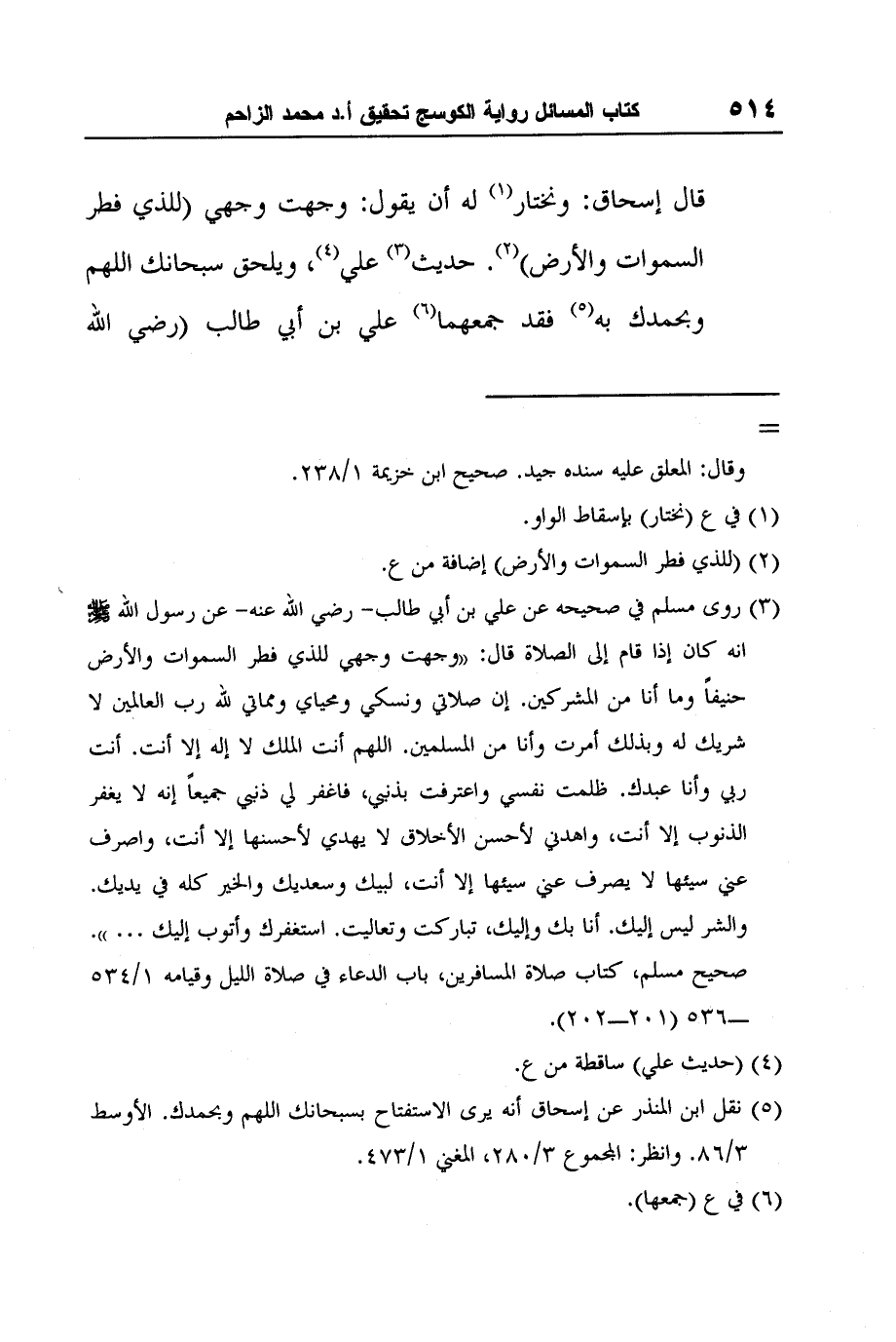 قال إسحاق: ونختار1 له أن يقول: وجهت وجهي (للذي فطر السموات والأرض) 2. حديث3 علي4، ويلحق سبحانك اللهم وبحمدك به5 فقد جمعهما6 علي بن أبي طالب (رضي الله