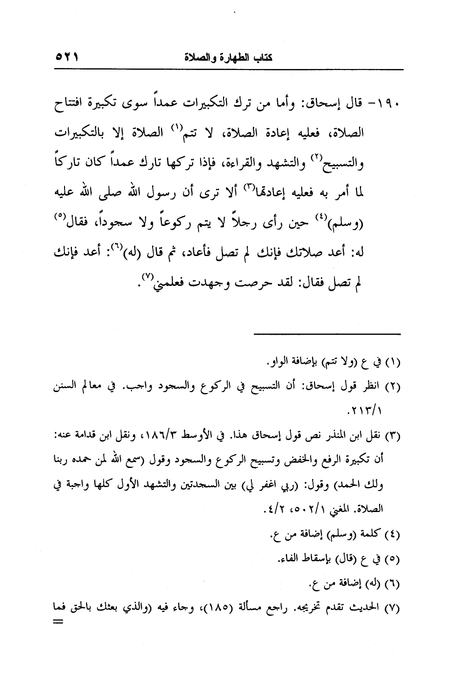 [190-] قال إسحاق: وأما من ترك التكبيرات عمداً سوى تكبيرة افتتاح الصلاة، فعليه إعادة الصلاة، لا تتم1 الصلاة إلا بالتكبيرات والتسبيح2 والتشهد والقراءة، فإذا تركها تارك عمداً كان تاركاً لما أمر به فعليه إعادتها3 ألا ترى أن رسول الله صلى الله عليه (وسلم) 4 حين رأى رجلاً لا يتم ركوعاً ولا سجوداً، فقال5 له: "أعد صلاتك فإنك لم تصل فأعاد، ثم قال (له) 6: أعد فإنك لم تصل" فقال: لقد حرصت وجهدت فعلمني7.