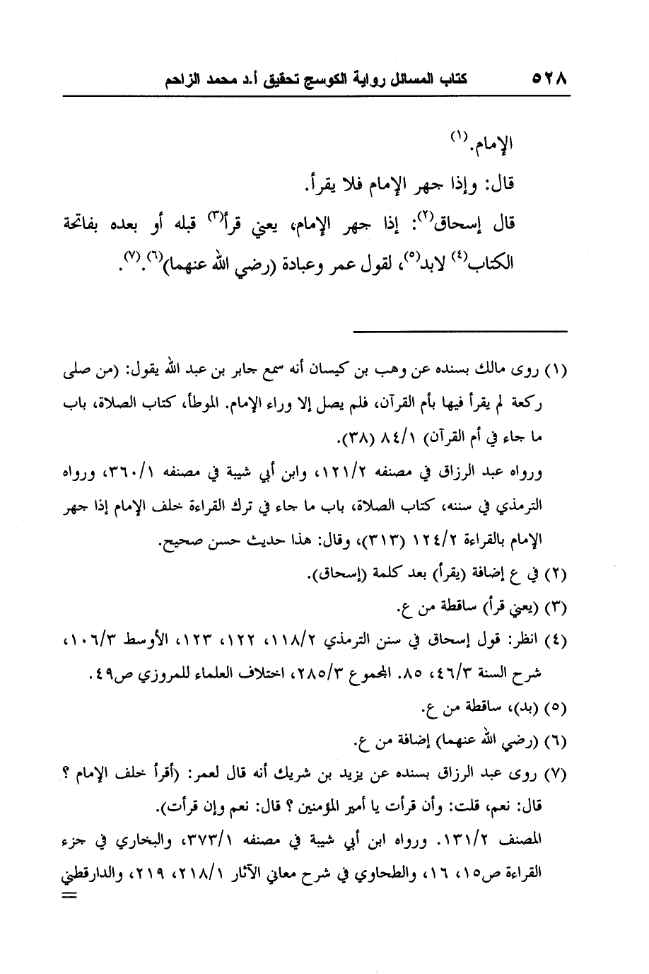 قال إسحاق2: إذا جهر الإمام، يعني قرأ3 قبله أو بعده بفاتحة الكتاب4 لابد5، لقول عمر وعبادة (رضي الله عنهما) 6.7.