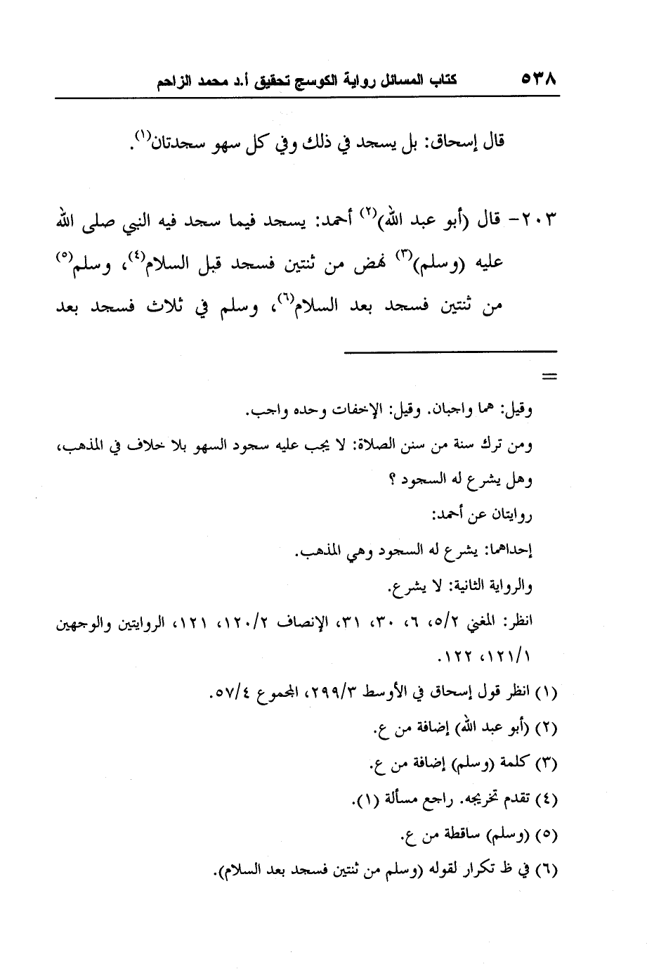 [203-] قال (أبو عبد الله) 2 أحمد: يسجد فيما سجد فيه النبي صلى الله عليه (وسلم) 3 نهض من ثنتين فسجد قبل السلام4، وسلم5 من ثنتين فسجد بعد السلام6، وسلم في ثلاث فسجد بعد