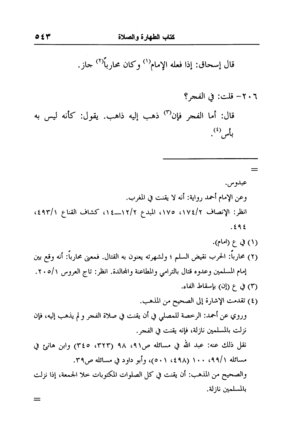 وروي عن أحمد: الرخصة للمصلي في أن يقنت في صلاة الفجر ولم يذهب إليه، فإن نزلت بالمسلمين نازلة، فإنه يقنت في الفجر.