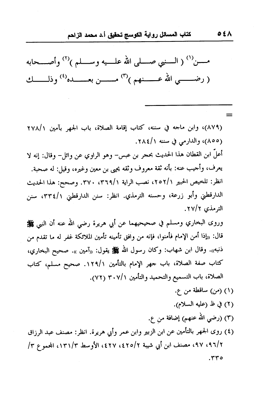 4 روى الجهر بالتأمين عن ابن الزبير وابن عمر وأبي هريرة. انظر: مصنف عبد الرزاق 2/96، 97، مصنف ابن أبي شيبة 2/425، 427، الأوسط 3/131، المجموع 3/335.