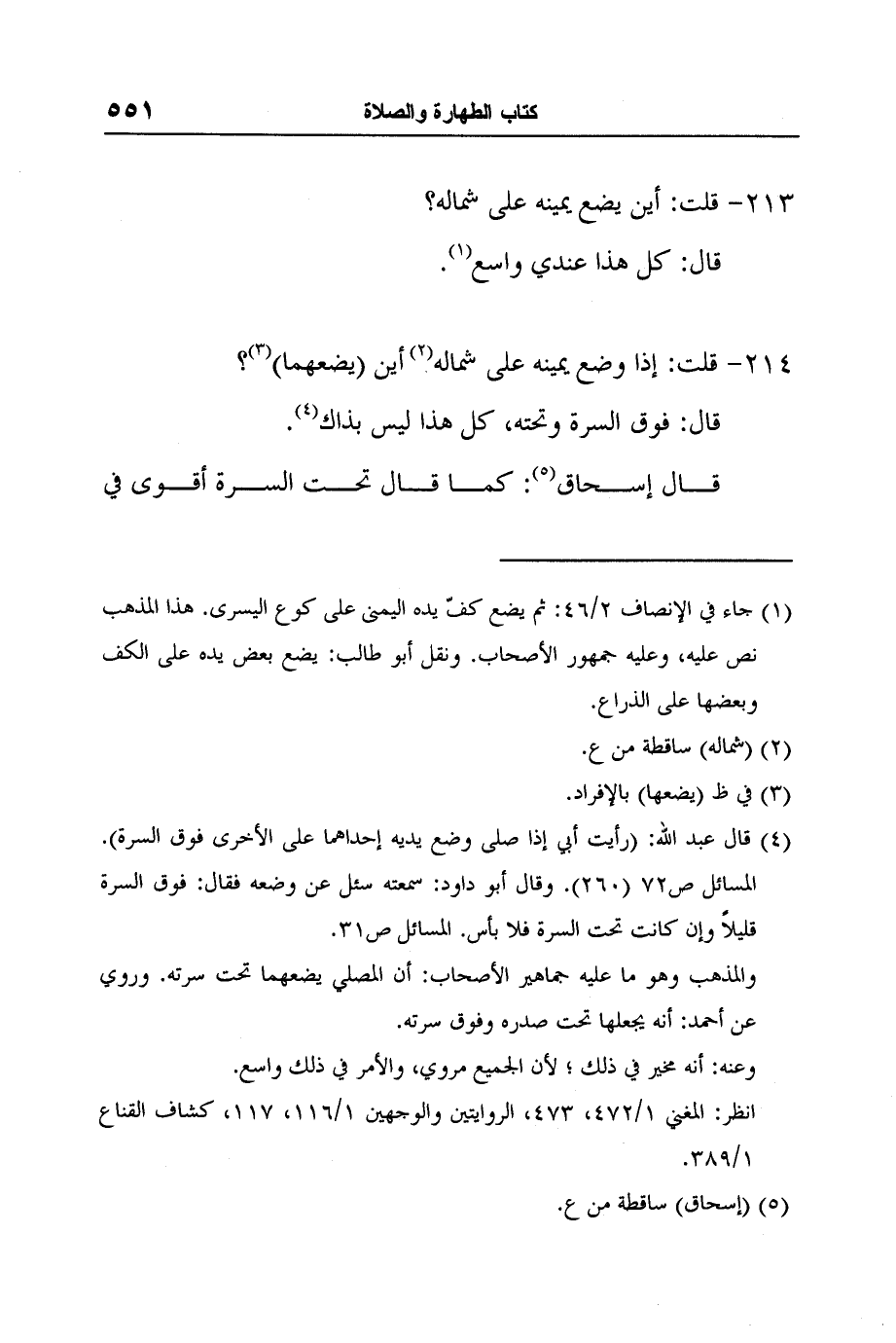 4 قال عبد الله: (رأيت أبي إذا صلى وضع يديه إحداهما على الأخرى فوق السرة) . المسائل ص72 (260) . وقال أبو داود: سمعته سئل عن وضعه فقال: فوق السرة قليلاً وإن كانت تحت السرة فلا بأس. المسائل ص31.
