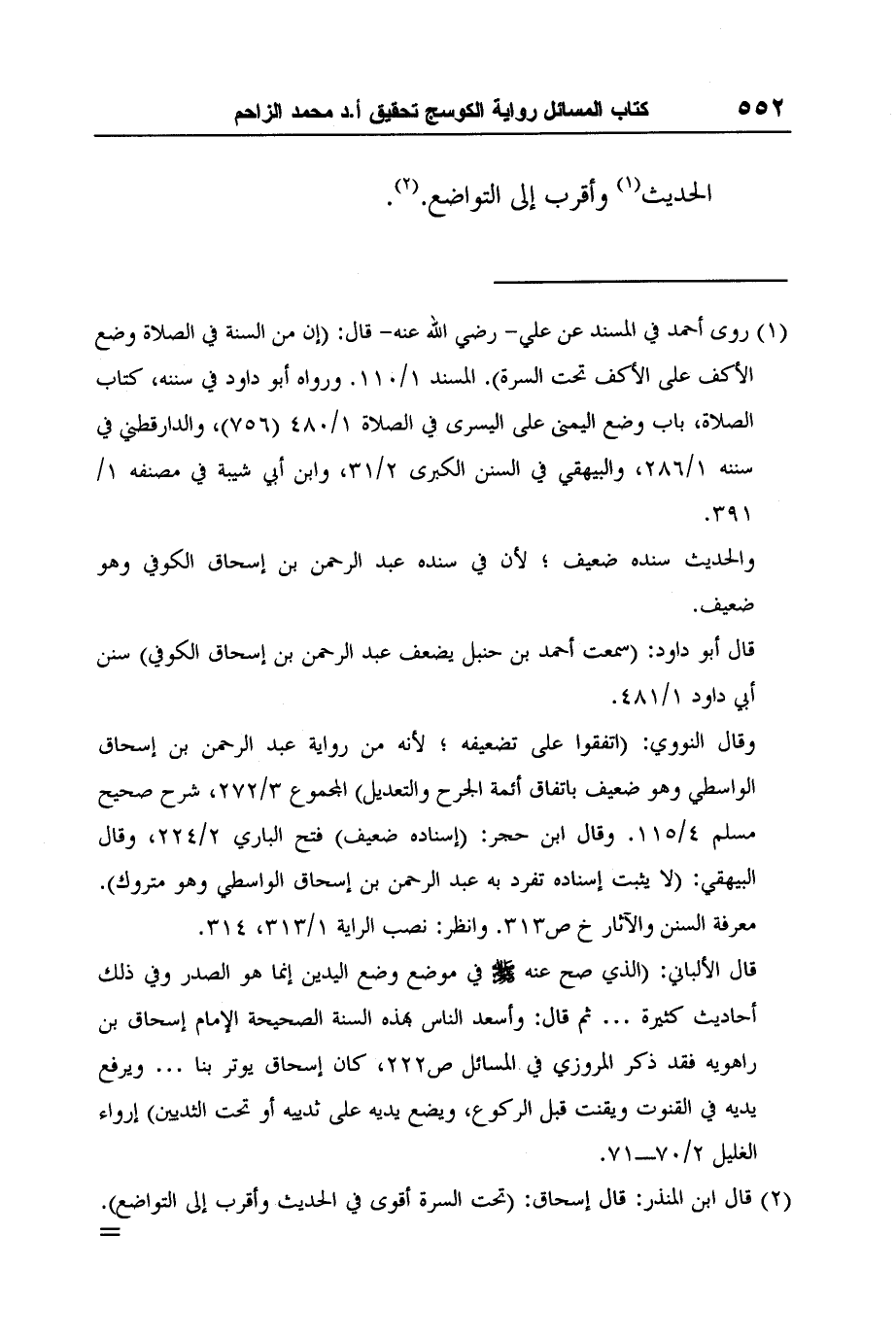 1 روى أحمد في المسند عن علي- رضي الله عنه- قال: (إن من السنة في الصلاة وضع الأكف على الأكف تحت السرة) . المسند 1/110. ورواه أبو داود في سننه، كتاب الصلاة، باب وضع اليمنى على اليسرى في الصلاة 1/480 (756) ، والدارقطني في سننه 1/286، والبيهقي في السنن الكبرى 2/31، وابن أبي شيبة في مصنفه 1/391.