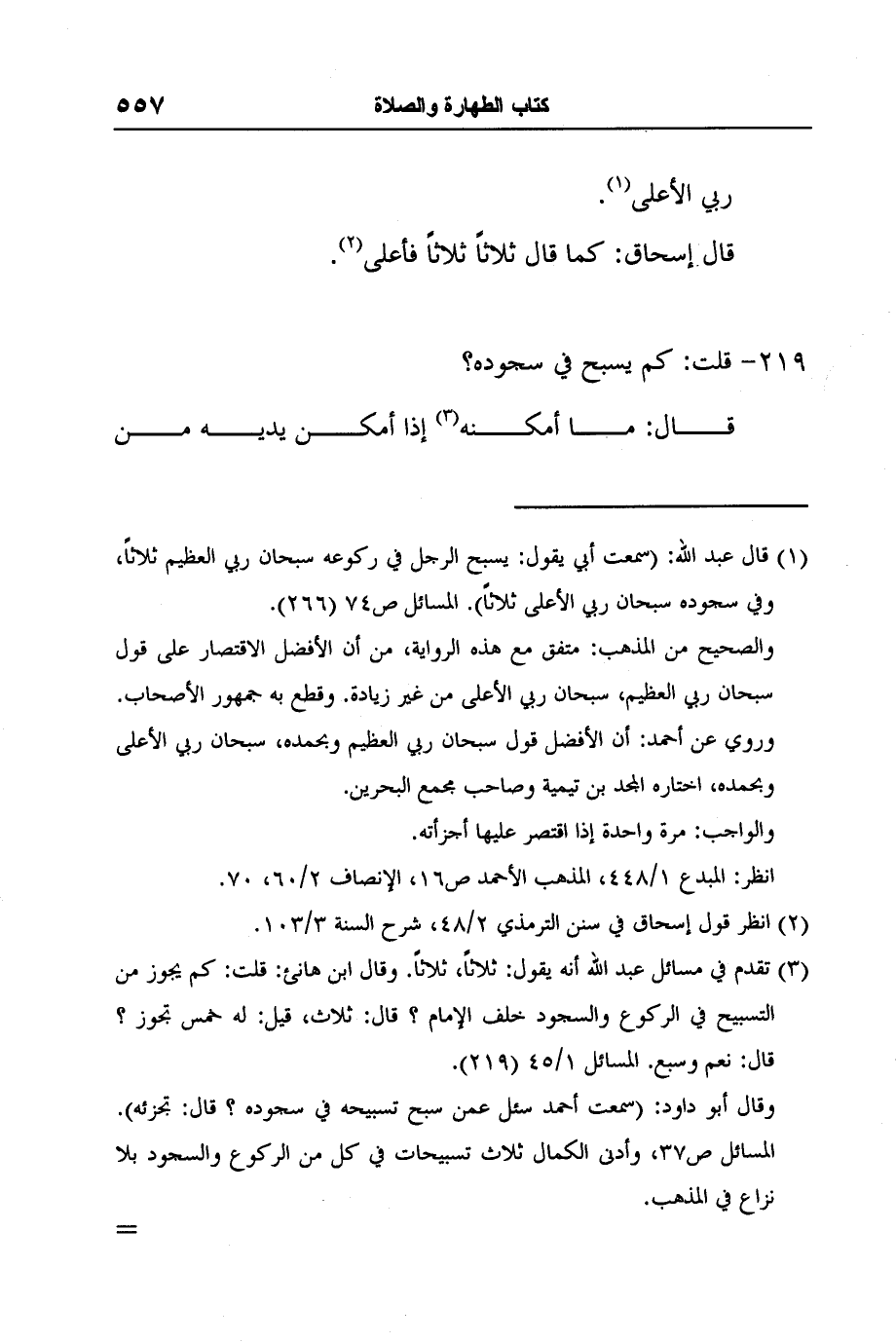 1 قال عبد الله: (سمعت أبي يقول: يسبح الرجل في ركوعه سبحان ربي العظيم ثلاثاً، وفي سجوده سبحان ربي الأعلى ثلاثاً) . المسائل ص74 (266) .