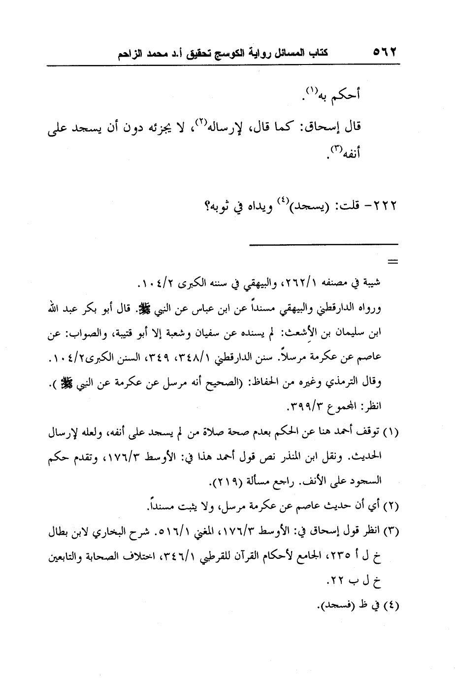 1 توقف أحمد هنا عن الحكم بعدم صحة صلاة من لم يسجد على أنفه، ولعله لإرسال الحديث. ونقل ابن المنذر نص قول أحمد هذا في: الأوسط 3/176، وتقدم حكم السجود على الأنف. راجع مسألة (219) .