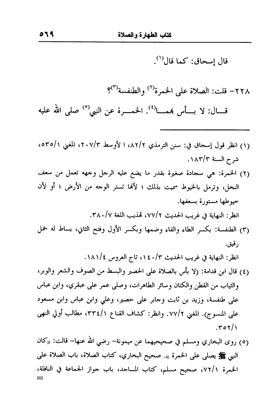 [228-] قلت: الصلاة على الخمرة2 والطنفسة3؟