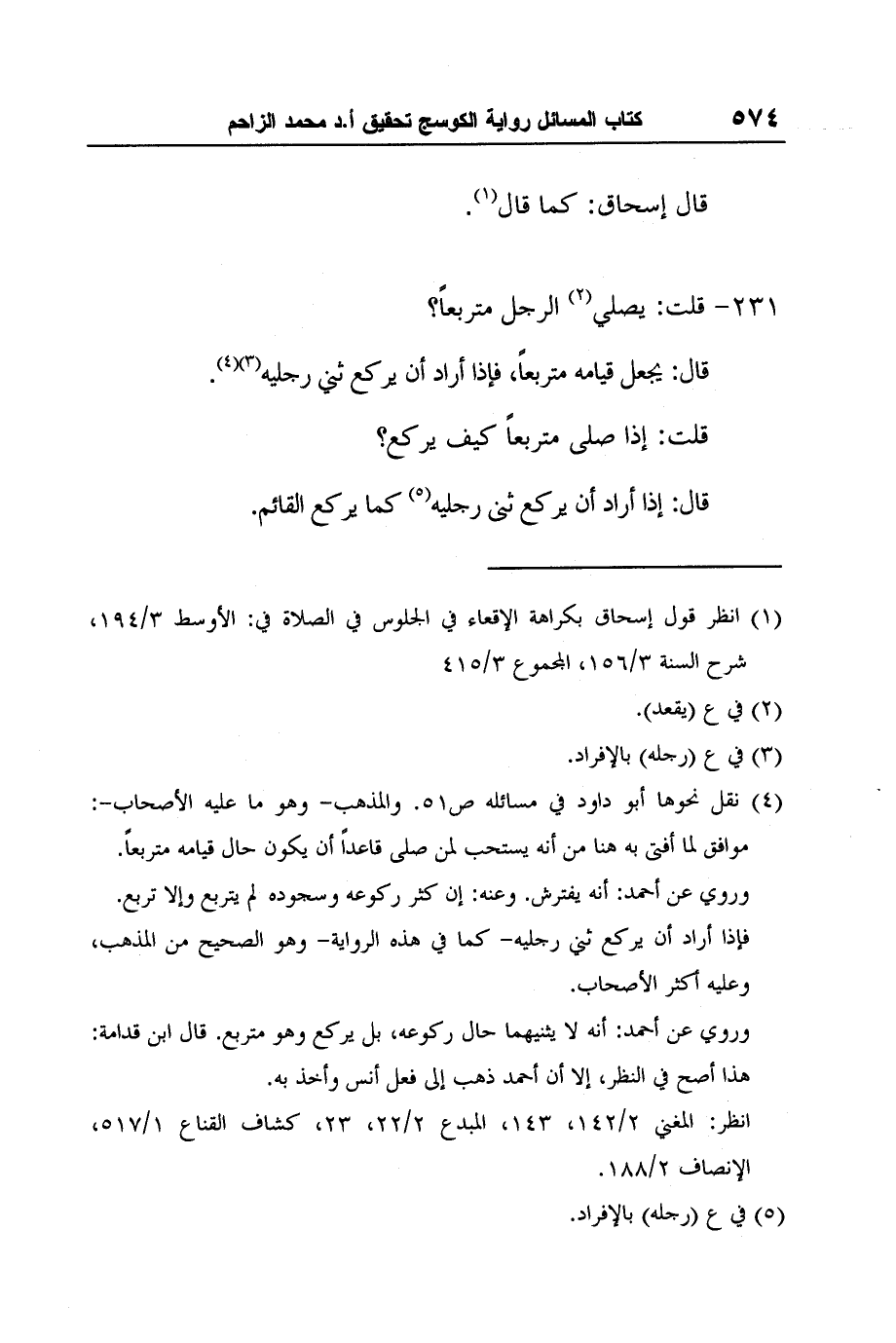 4 نقل نحوها أبو داود في مسائله ص51. والمذهب- وهو ما عليه الأصحاب-: موافق لما أفتى به هنا من أنه يستحب لمن صلى قاعداً أن يكون حال قيامه متربعاً.