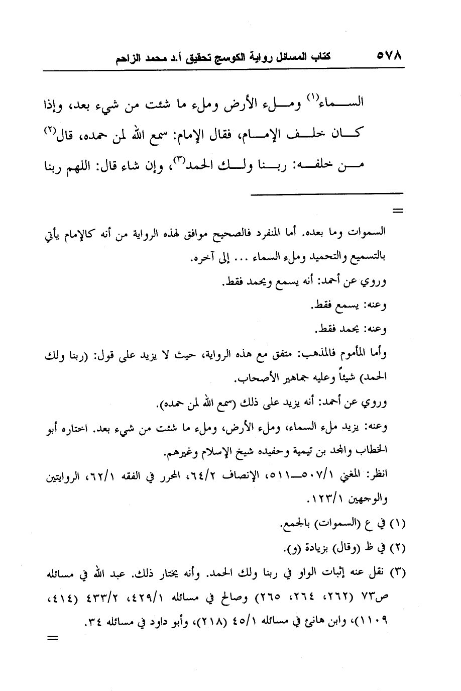 2 نقل عنه إثبات الواو في ربنا ولك الحمد. وأنه يختار ذلك. عبد الله في مسائله ص73 (262، 264، 265) وصالح في مسائله 1/429، 2/433 (414، 1109) ، وابن هانئ في مسائله 1/45 (218) ، وأبو داود في مسائله 34.
