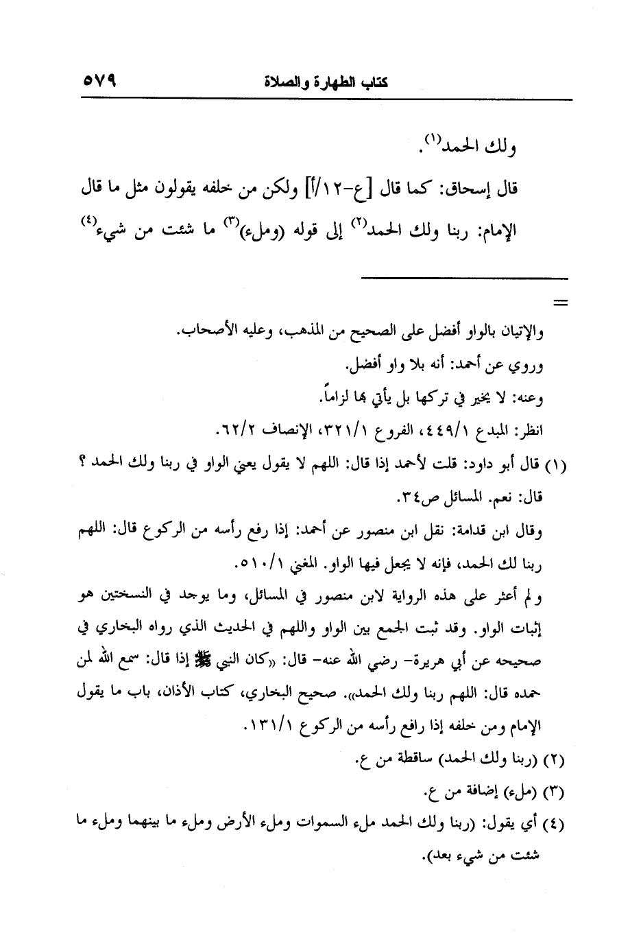 وقال ابن قدامة: نقل ابن منصور عن أحمد: إذا رفع رأسه من الركوع قال: اللهم ربنا لك الحمد، فإنه لا يجعل فيها الواو. المغني 1/510.