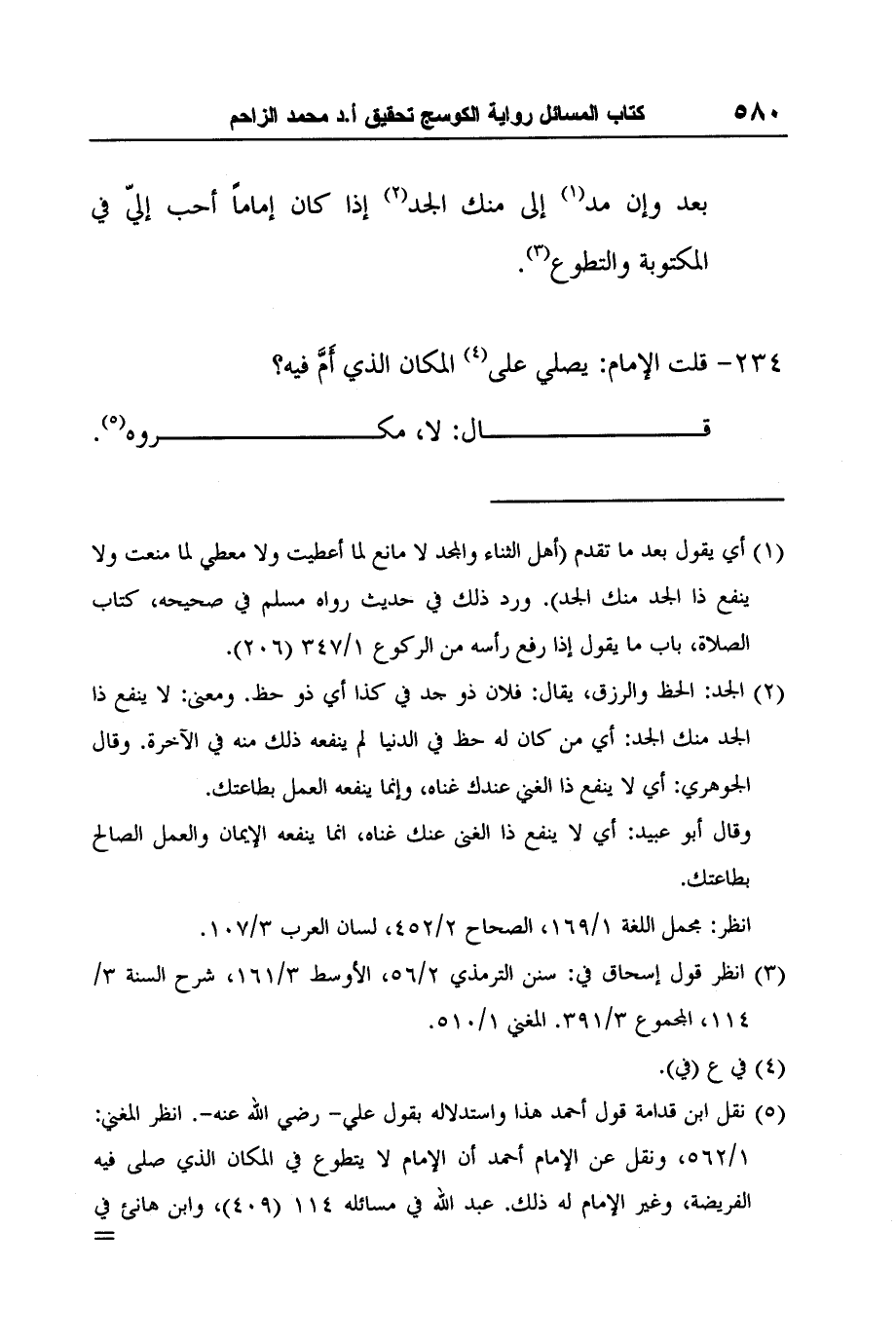 1 بعد وإن مد2 إلى منك الجد3 إذا كان إماماً أحب إليّ في المكتوبة والتطوع4.