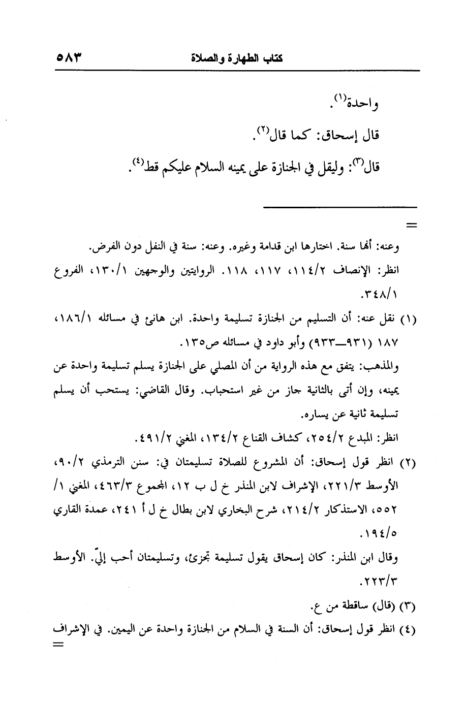 2 انظر قول إسحاق: أن المشروع للصلاة تسليمتان في: سنن الترمذي 2/90، الأوسط 3/221، الإشراف لابن المنذر خ ل ب 12، المجموع 3/463، المغني 1/552، الاستذكار 2/214، شرح البخاري لابن بطال خ ل أ 241، عمدة القاري 5/194.