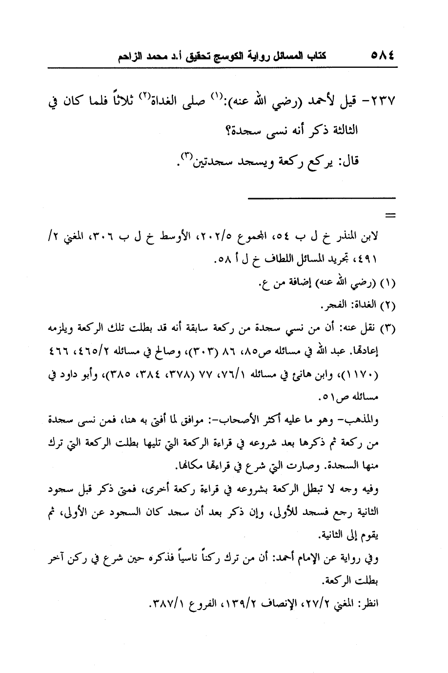 [237-] قيل لأحمد (رضي الله عنه) :1 صلى الغداة2 ثلاثاً فلما كان في الثالثة ذكر أنه نسى سجدة؟