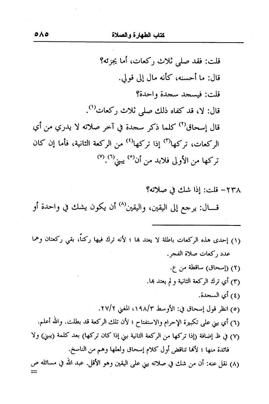 8 نقل عنه: أن من شك في صلاته يني على اليقين وهو الأقل. عبد الله في مسائله ص89 (315) ، وابن هانئ في مسائله 1/77 (382) ، وأبو داود في مسائله ص52، 54. وتقدم بيان المذهب. راجع مسألة (203) .
