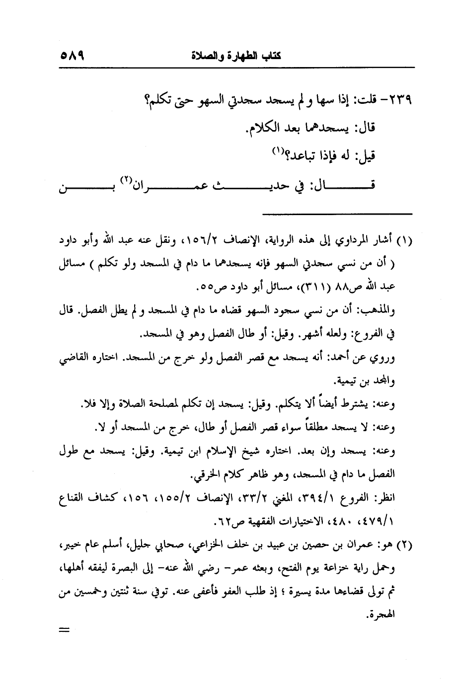 1 أشار المرداوي إلى هذه الرواية، الإنصاف 2/156، ونقل عنه عبد الله وأبو داود (أن من نسي سجدتي السهو فإنه يسجدهما ما دام في المسجد ولو تكلم) مسائل عبد الله ص88 (311) ، مسائل أبو داود ص55.