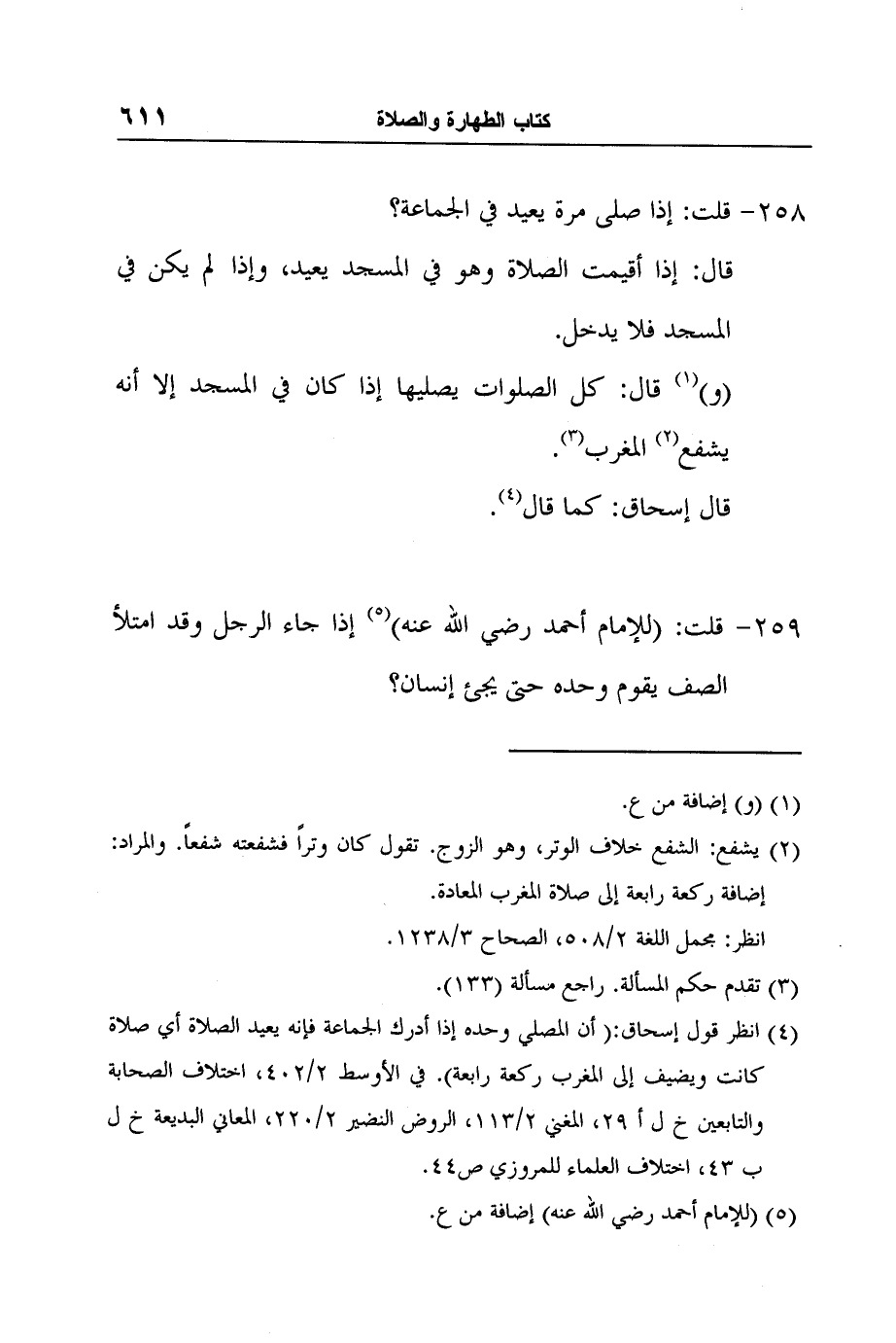 4 انظر قول إسحاق: (أن المصلي وحده إذا أدرك الجماعة فإنه يعيد الصلاة أي صلاة كانت ويضيف إلى المغرب ركعة رابعة) . في الأوسط 2/402، اختلاف الصحابة والتابعين خ ل أ 29، المغني 2/113، الروض النضير 2/220، المعاني البديعة خ ل ب 43، اختلاف العلماء للمروزي ص44.