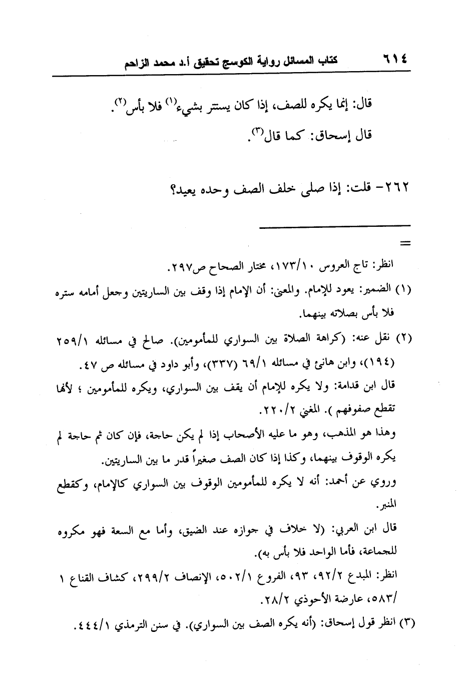 3 انظر قول إسحاق: (أنه يكره الصف بين السواري) . في سنن الترمذي 1/444.