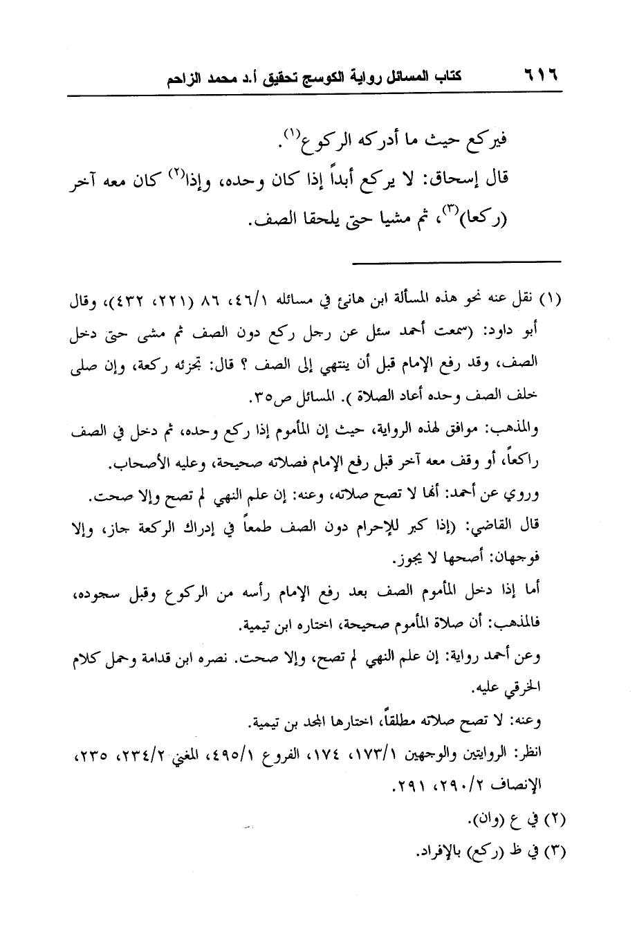 1 نقل عنه نحو هذه المسألة ابن هانئ في مسائله 1/46، 86 (221، 432) ، وقال أبو داود: (سمعت أحمد سئل عن رجل ركع دون الصف ثم مشى حتى دخل الصف، وقد رفع الإمام قبل أن ينتهي إلى الصف؟ قال: تجزئه ركعة، وإن صلى خلف الصف وحده أعاد الصلاة) . المسائل ص35.