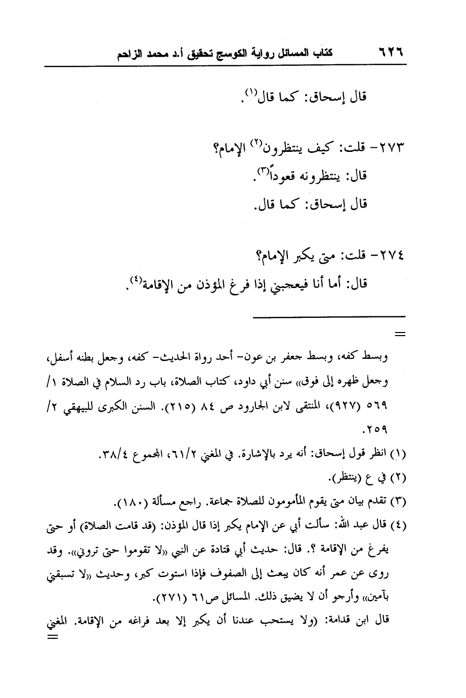 4 قال عبد الله: سألت أبي عن الإمام يكبر إذا قال المؤذن: (قد قامت الصلاة) أو حتى يفرغ من الإقامة؟. قال: حديث أبي قتادة عن النبي "لا تقوموا حتى تروني". وقد روى عن عمر أنه كان يبعث إلى الصفوف فإذا استوت كبر، وحديث "لا تسبقني بآمين" وأرجو أن لا يضيق ذلك. المسائل ص61 (271) .