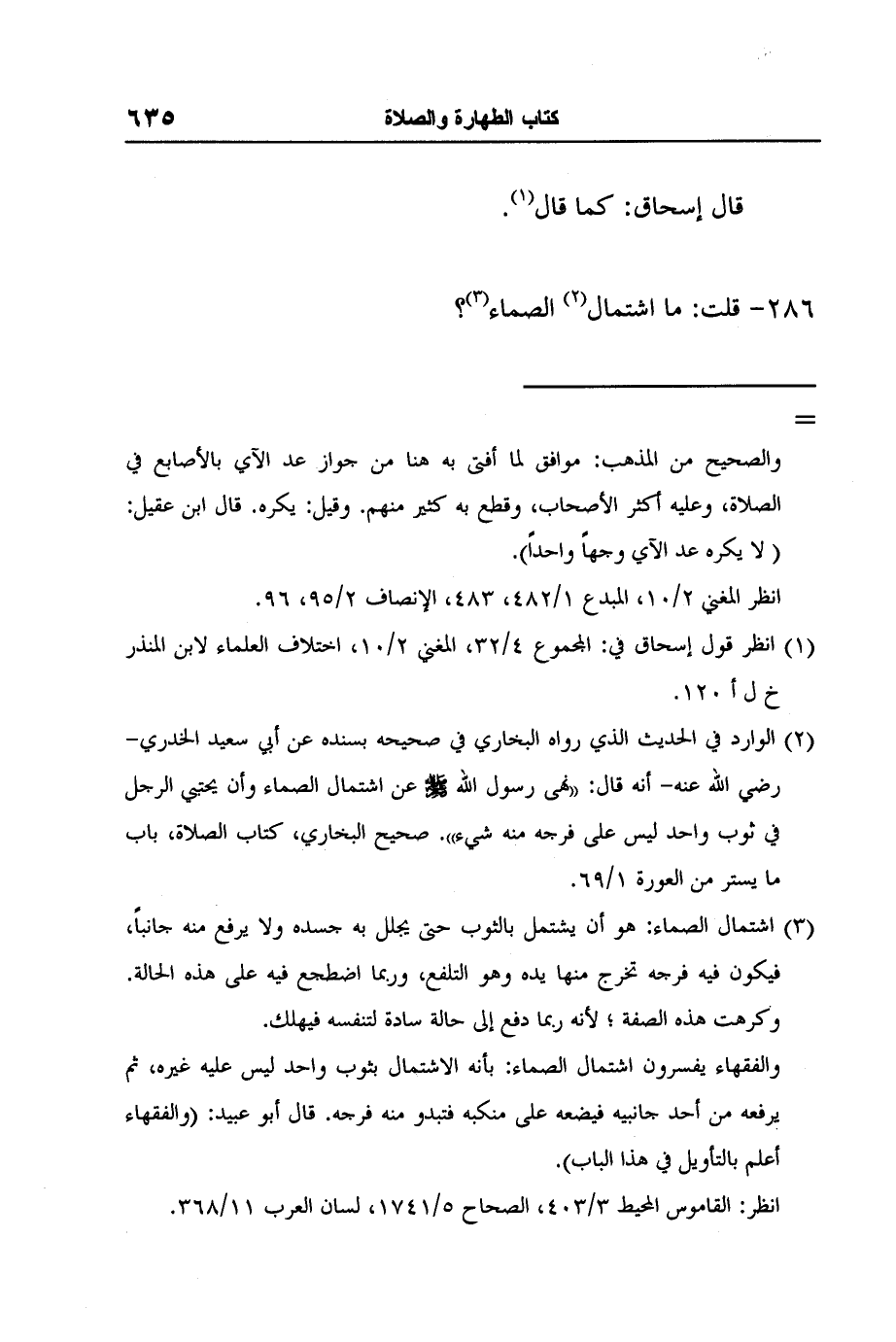 والفقهاء يفسرون اشتمال الصماء: بأنه الاشتمال بثوب واحد ليس عليه غيره، ثم يرفعه من أحد جانبيه فيضعه على منكبه فتبدو منه فرجه. قال أبو عبيد: (والفقهاء أعلم بالتأويل في هذا الباب) .