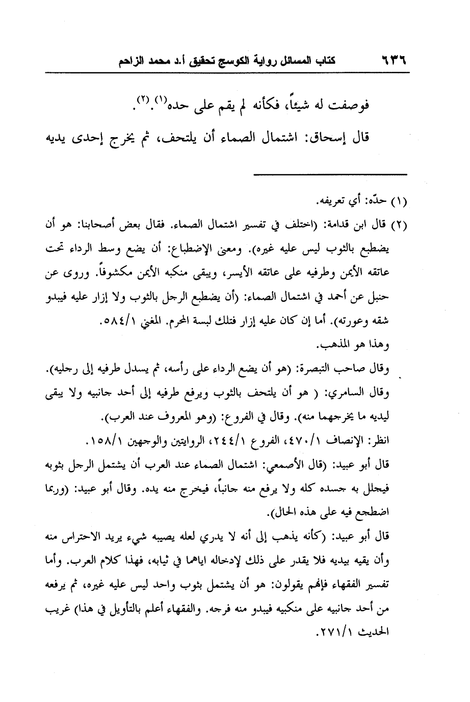 قال إسحاق: اشتمال الصماء أن يلتحف، ثم يخرج إحدى يديه