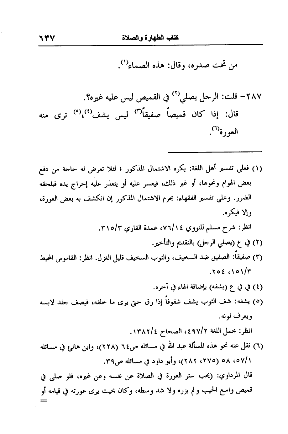 [287-] قلت: الرجل يصلي2 في القميص ليس عليه غيره؟.
