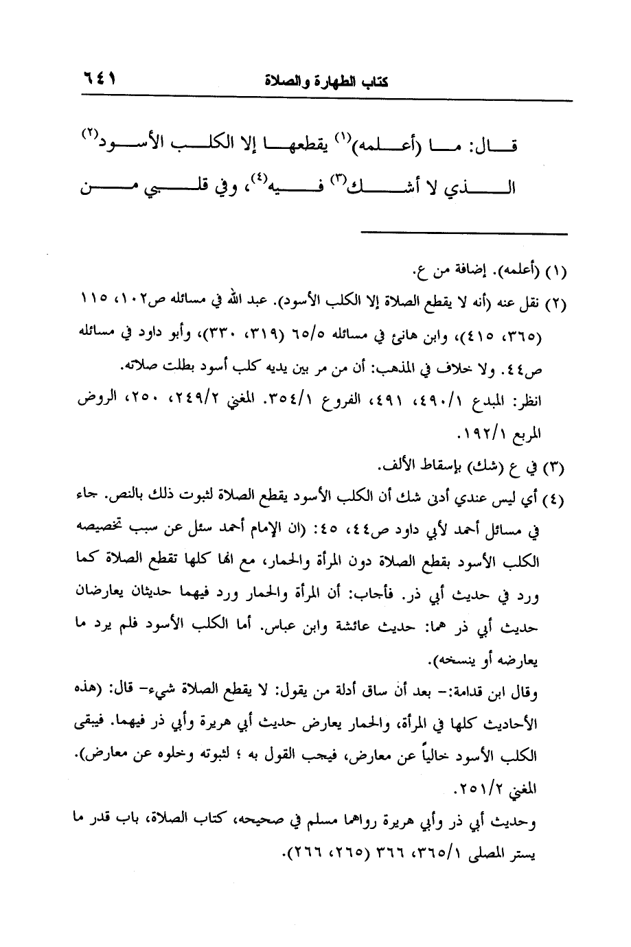 4 أي ليس عندي أدنى شك أن الكلب الأسود يقطع الصلاة لثبوت ذلك بالنص. جاء في مسائل أحمد لأبي داود ص44، 45: (ان الإمام أحمد سئل عن سبب تخصيصه الكلب الأسود بقطع الصلاة دون المرأة والحمار، مع انها كلها تقطع الصلاة كما ورد في حديث أبي ذر. فأجاب: أن المرأة والحمار ورد فيهما حديثان يعارضان حديث أبي ذر هما: حديث عائشة وابن عباس. أما الكلب الأسود فلم يرد ما يعارضه أو ينسخه) .