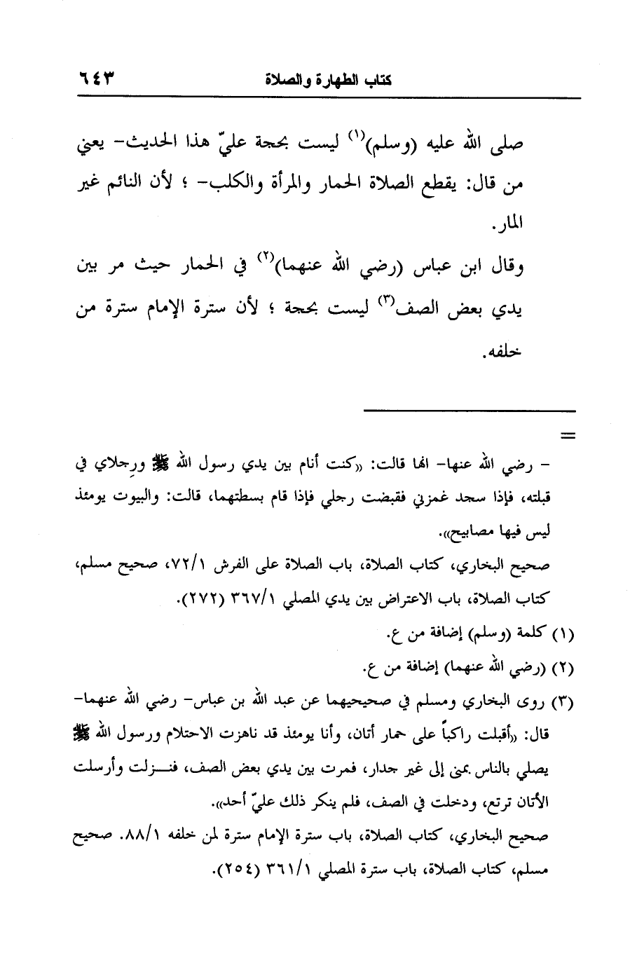 3 روى البخاري ومسلم في صحيحيهما عن عبد الله بن عباس- رضي الله عنهما- قال: "أقبلت راكباً على حمار أتان، وأنا يومئذ قد ناهزت الاحتلام ورسول الله صلى الله عليه وسلم يصلي بالناس بمنى إلى غير جدار، فمرت بين يدي بعض الصف، فنزلت وأرسلت الأتان ترتع، ودخلت في الصف، فلم ينكر ذلك عليّ أحد".