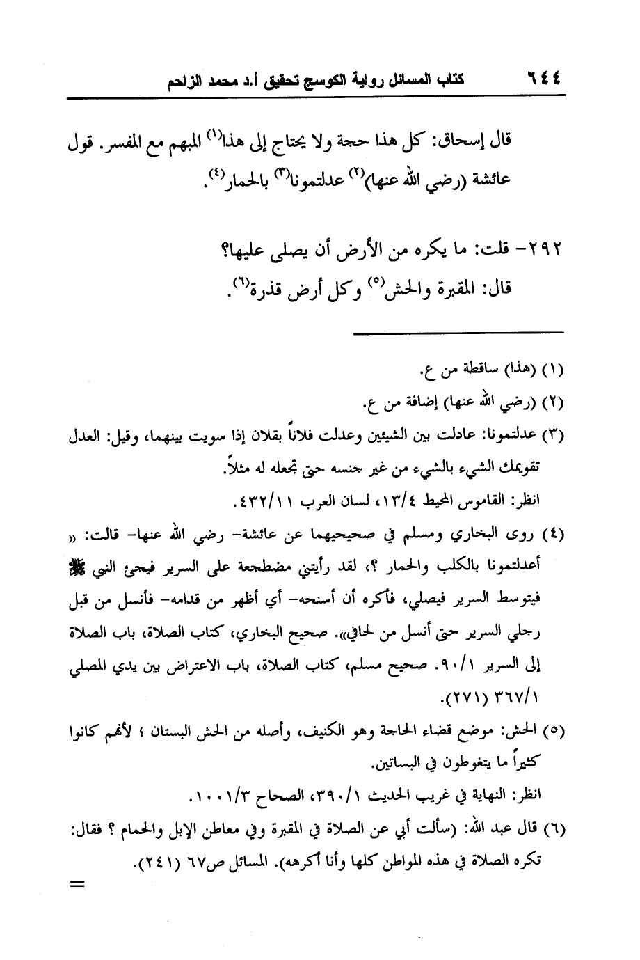 قال إسحاق: كل هذا حجة ولا يحتاج إلى هذا1 المبهم مع المفسر. قول عائشة (رضي الله عنها) 2 عدلتمونا3 بالحمار4.