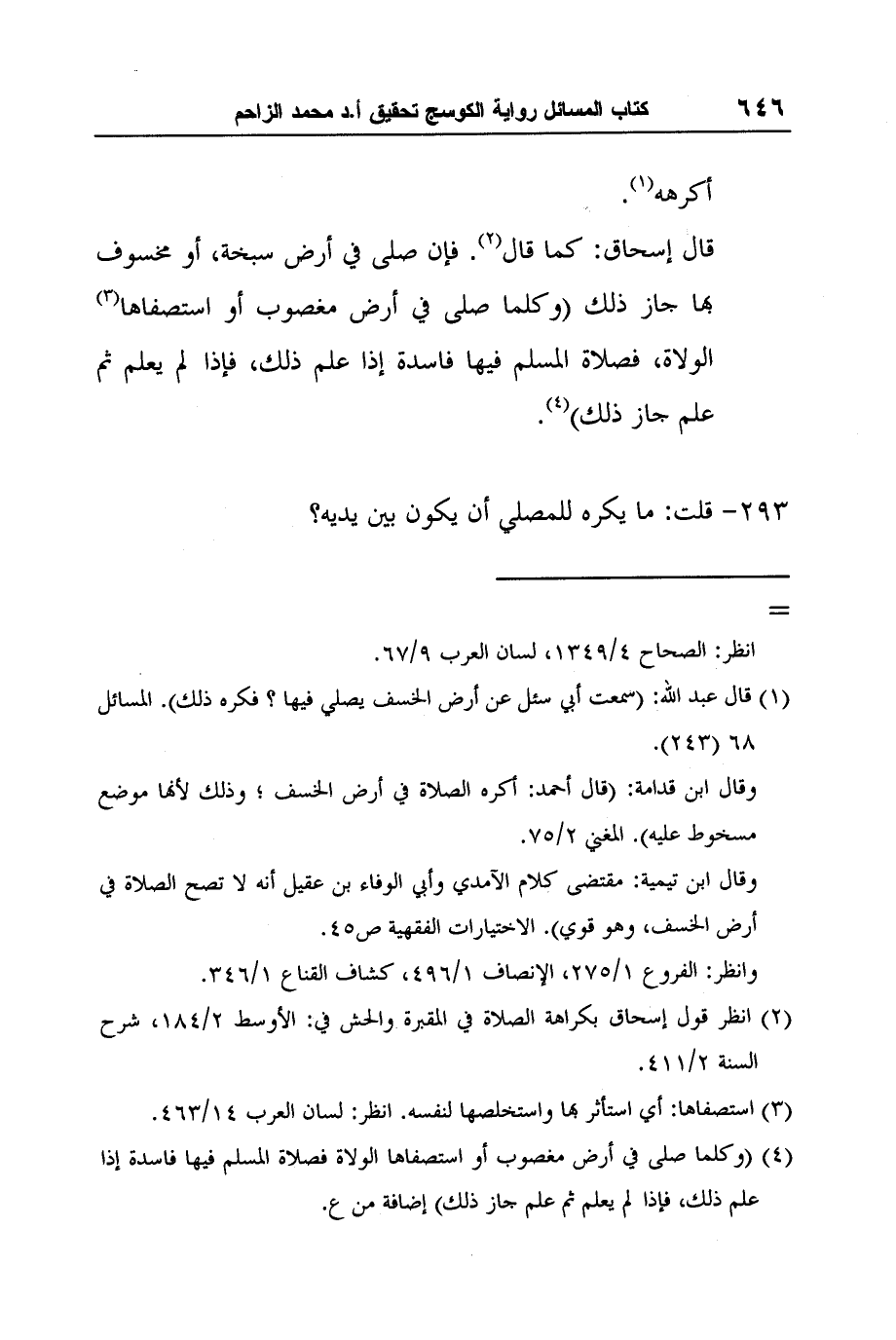 قال إسحاق: كما قال2. فإن صلى في أرض سبخة، أو مخسوف بها جاز ذلك (وكلما صلى في أرض مغصوب أو استصفاها3 الولاة، فصلاة المسلم فيها فاسدة إذا علم ذلك، فإذا لم يعلم ثم علم جاز ذلك) 4.