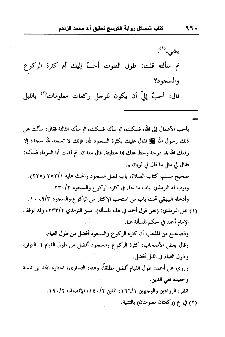 وروي عن أحمد: طول القيام أفضل مطلقاً، وعنه: التساوي، اختاره المجد بن تيمية وحفيده تقي الدين.