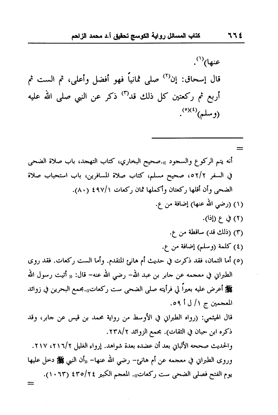 قال إسحاق: إن2 صلى ثمانياً فهو أفضل وأعلى، ثم الست ثم أربع ثم ركعتين كل ذلك قد3 ذكر عن النبي صلى الله عليه (وسلم) 45.