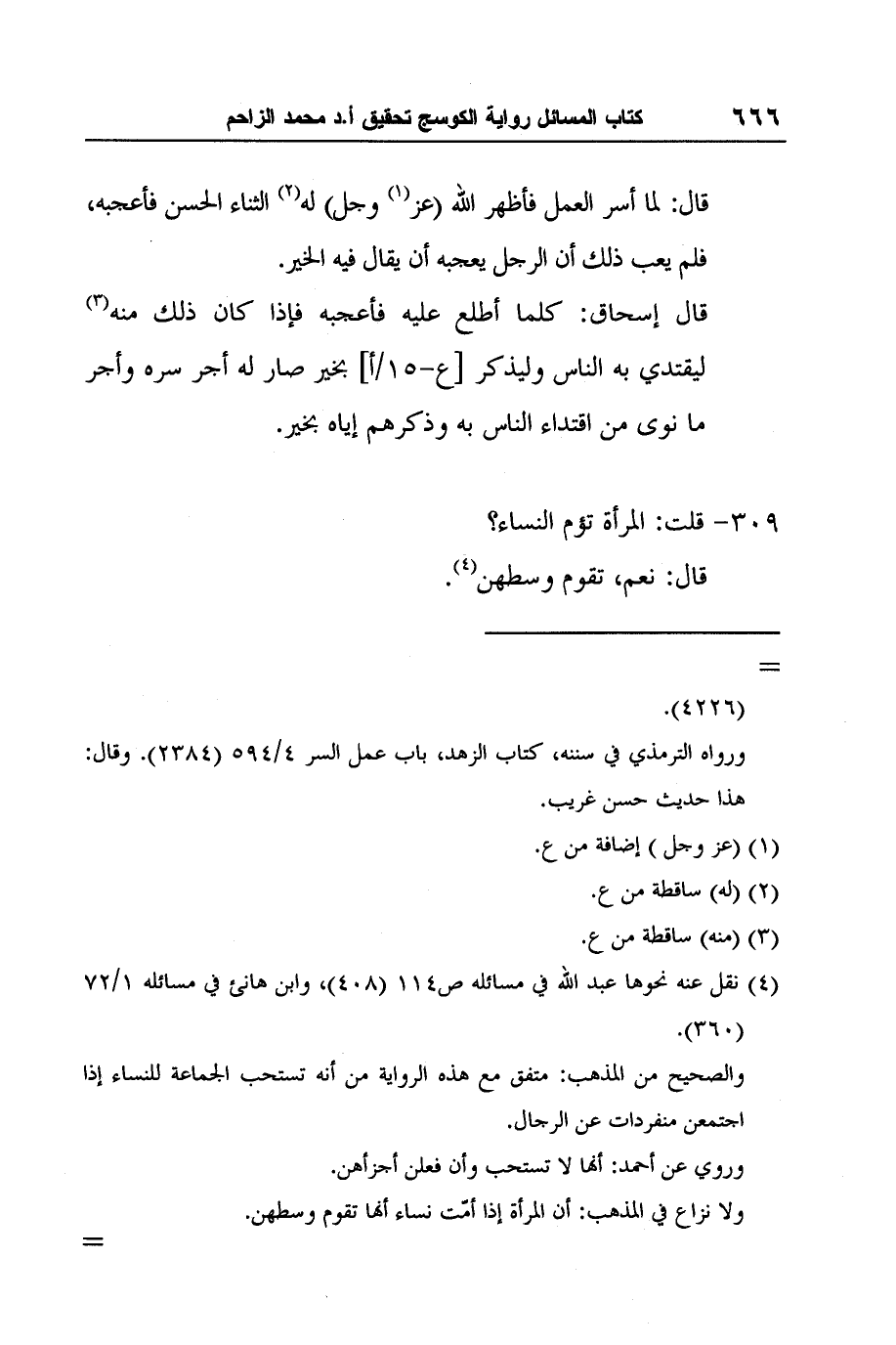 4 نقل عنه نحوها عبد الله في مسائله ص114 (408) ، وابن هانئ في مسائله 1/72 (360) .