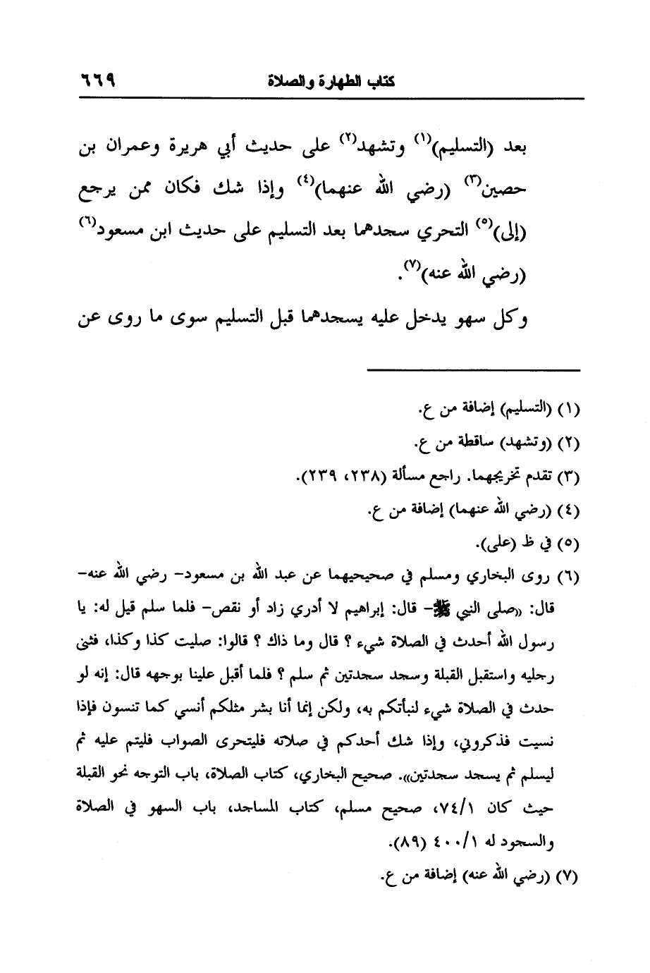 بعد (التسليم) 1 وتشهد2 على حديث أبي هريرة وعمران بن حصين3 (رضي الله عنهما) 4 وإذا شك فكان ممن يرجع (إلى) 5 التحري سجدهما بعد التسليم على حديث ابن مسعود6 (رضي الله عنه) 7.