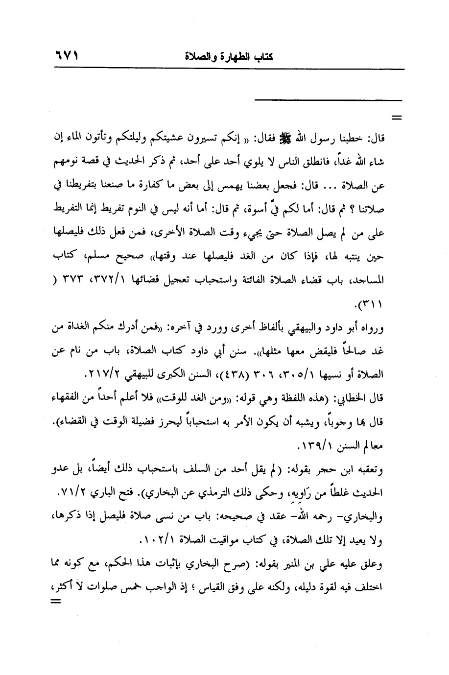 لكن في رواية أبي داود … في هذه القصة: (من أدرك منكم صلاة الغداة من غد صالحاً فليقض معها مثلها) فتح الباري 2/71. قال البيهقي: قال محمد بن إسماعيل البخاري: (لا يتابع في قوله من نسى صلاة فليصلها إذا ذكرها ولوقتها من الغد) ثم قال البيهقي: الذي يدل على ضعف هذه الكلمة، وأن الصحيح ما مضى من رواية سليمان بن المغيرة أن عمران بن حصين أحد الركب كما حدث عبد الله بن رباح عنه، وقد صرح في رواية هذا الحديث بأنه لا يجب مع القضاء غيره) السنن الكبرى 2/217.