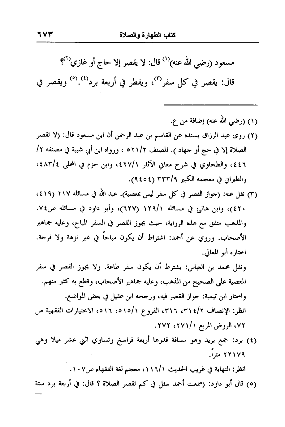 2 روى عبد الرزاق بسنده عن القاسم بن عبد الرحمن أن ابن مسعود قال: (لا تقصر الصلاة إلا في حج أو جهاد) . المصنف 2/521 , ورواه ابن أبي شيبة في مصنفه 2/446، والطحاوي في شرح معاني الآثار 1/427، وابن حزم في المحلى 4/483، والطبراني في معجمه الكبير 9/333 (9454) .