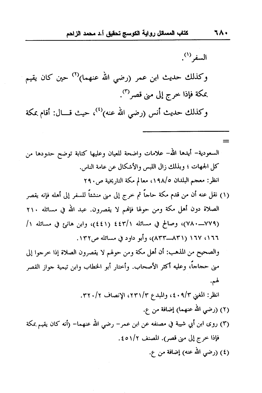 1 نقل عنه أن من قدم مكة حاجاً ثم خرج إلى منى منشئاً للسفر إلى أهله فإنه يقصر الصلاة دون أهل مكة ومن حولها فإنهم لا يقصرون. عبد الله في مسائله 210 (779ـ780) ، وصالح في مسائله 1/443 (441) ، وابن هانئ في مسائله 1/166، 167 (831ـ833) ، وأبو داود في مسائله ص132.