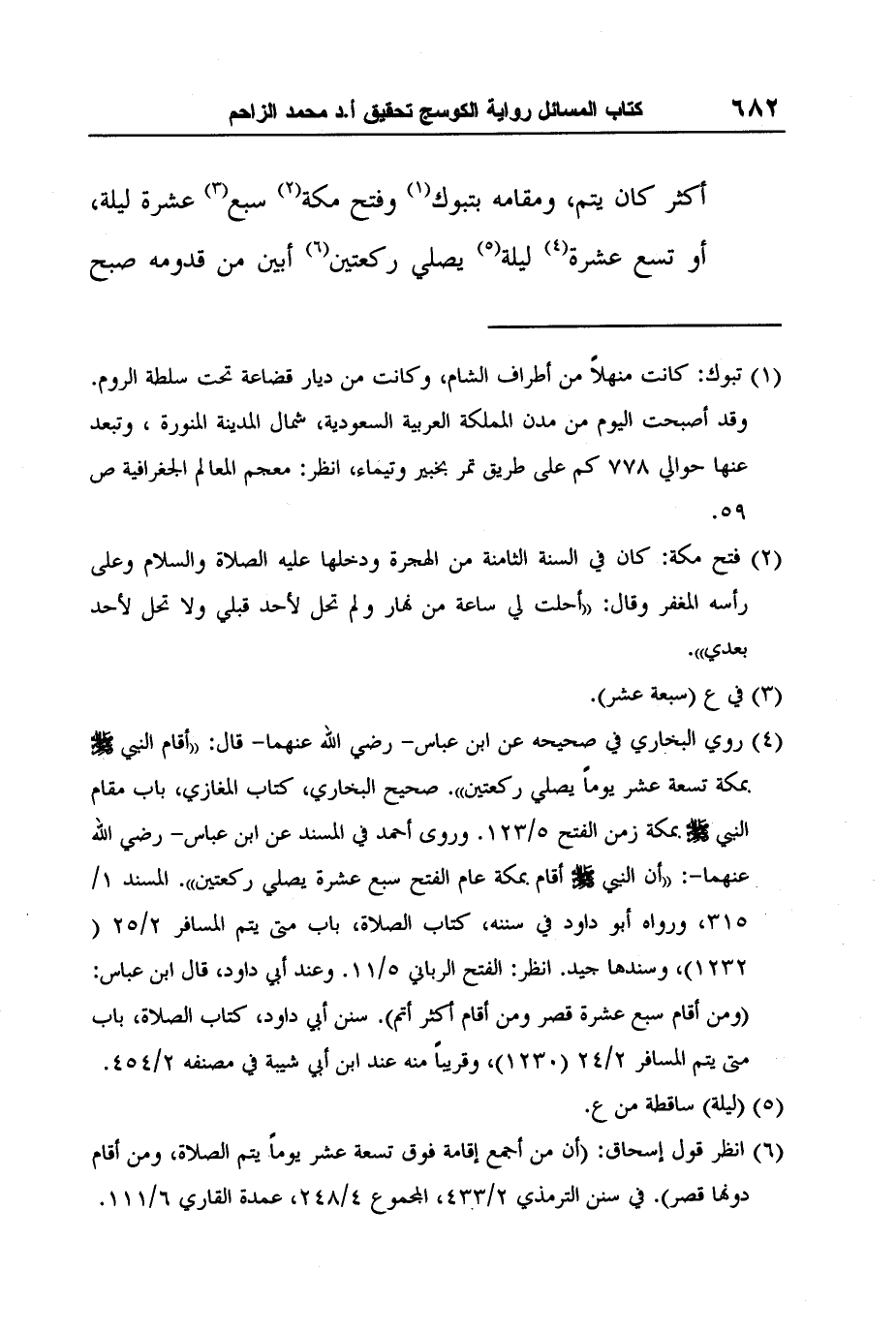 أكثر كان يتم، ومقامه بتبوك1 وفتح مكة2 سبع3 عشرة ليلة، أو تسع عشرة4 ليلة5 يصلي ركعتين6 أبين من قدومه صبح