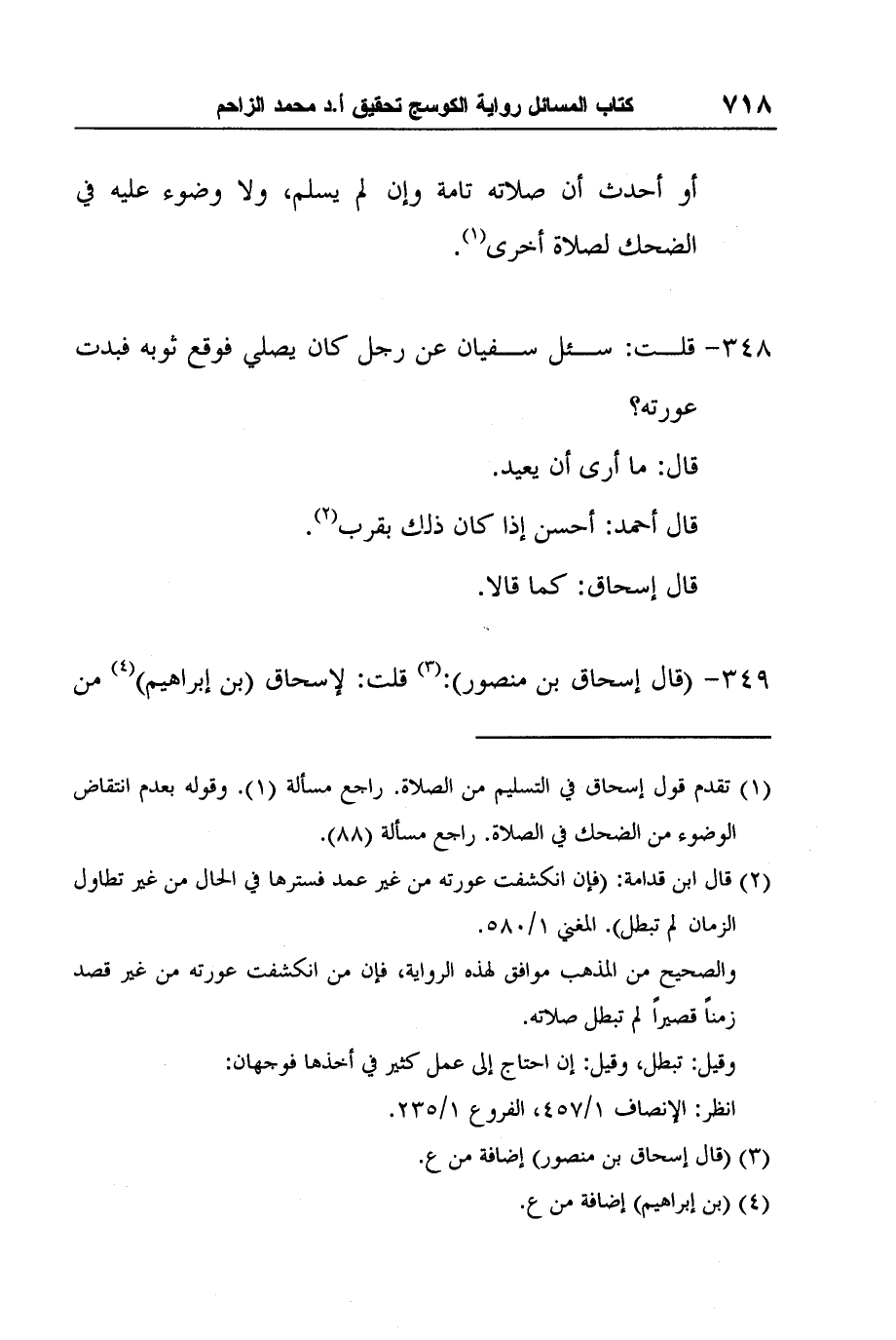1 تقدم قول إسحاق في التسليم من الصلاة. راجع مسألة (1) . وقوله بعدم انتقاض الوضوء من الضحك في الصلاة. راجع مسألة (88) .