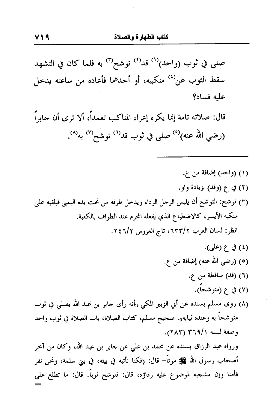 8 روى مسلم بسنده عن أبي الزبير المكي "أنه رأى جابر بن عبد الله يصلي في ثوب متوشحاً به وعنده ثيابه". صحيح مسلم، كتاب الصلاة، باب الصلاة في ثوب واحد وصفة لبسه 1/369 (283) .